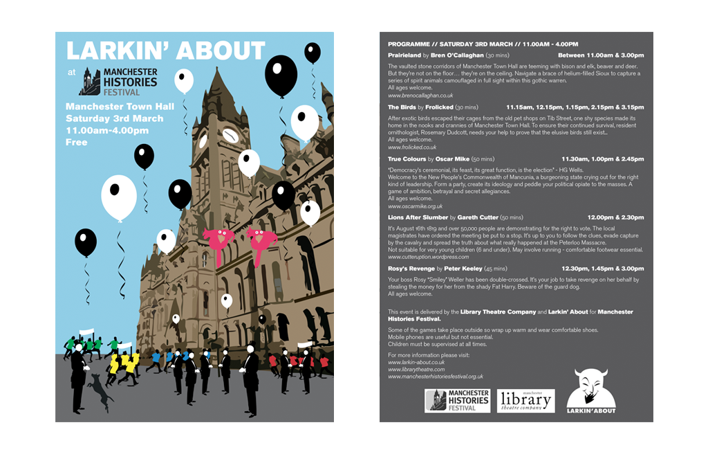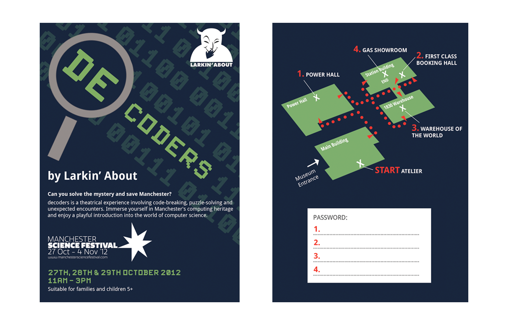 Promotional flyers for the now renamed Larkin' About (The Larks). The events seen here are their own event at Manchester Histories Festival, the flyer for which represents the games which made up the schedule that day. Also shown is their Decoders game for the Manchester Science Festival 2012.